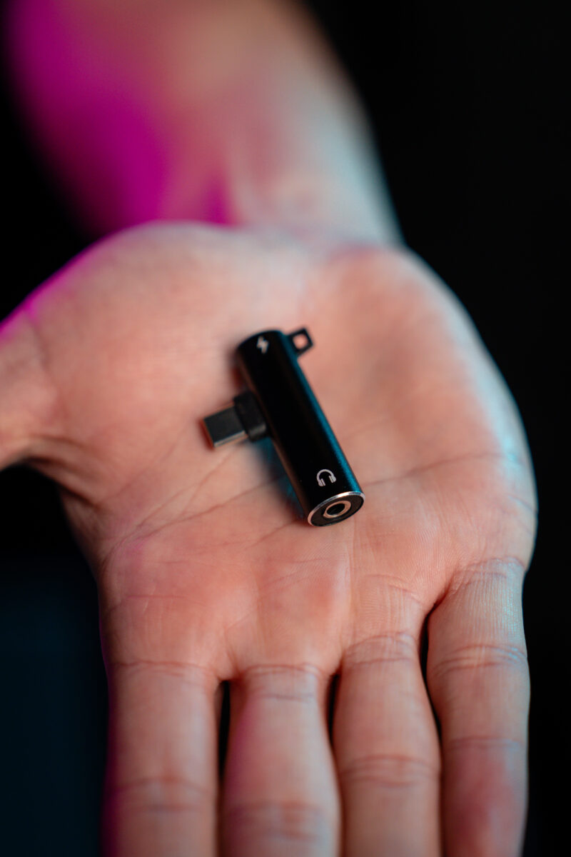 • Adaptor mini de tip USB-C cu iesire la 2 USB-C: incarcare USB-C + jack 3.5mm