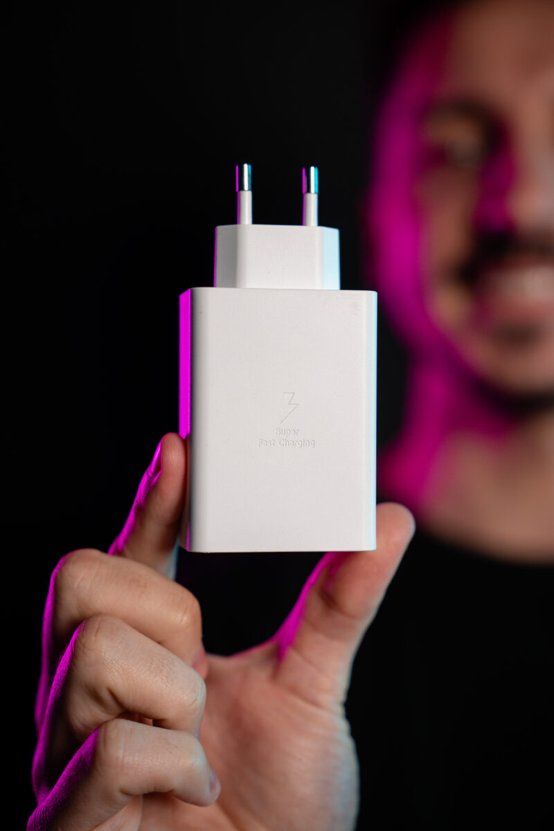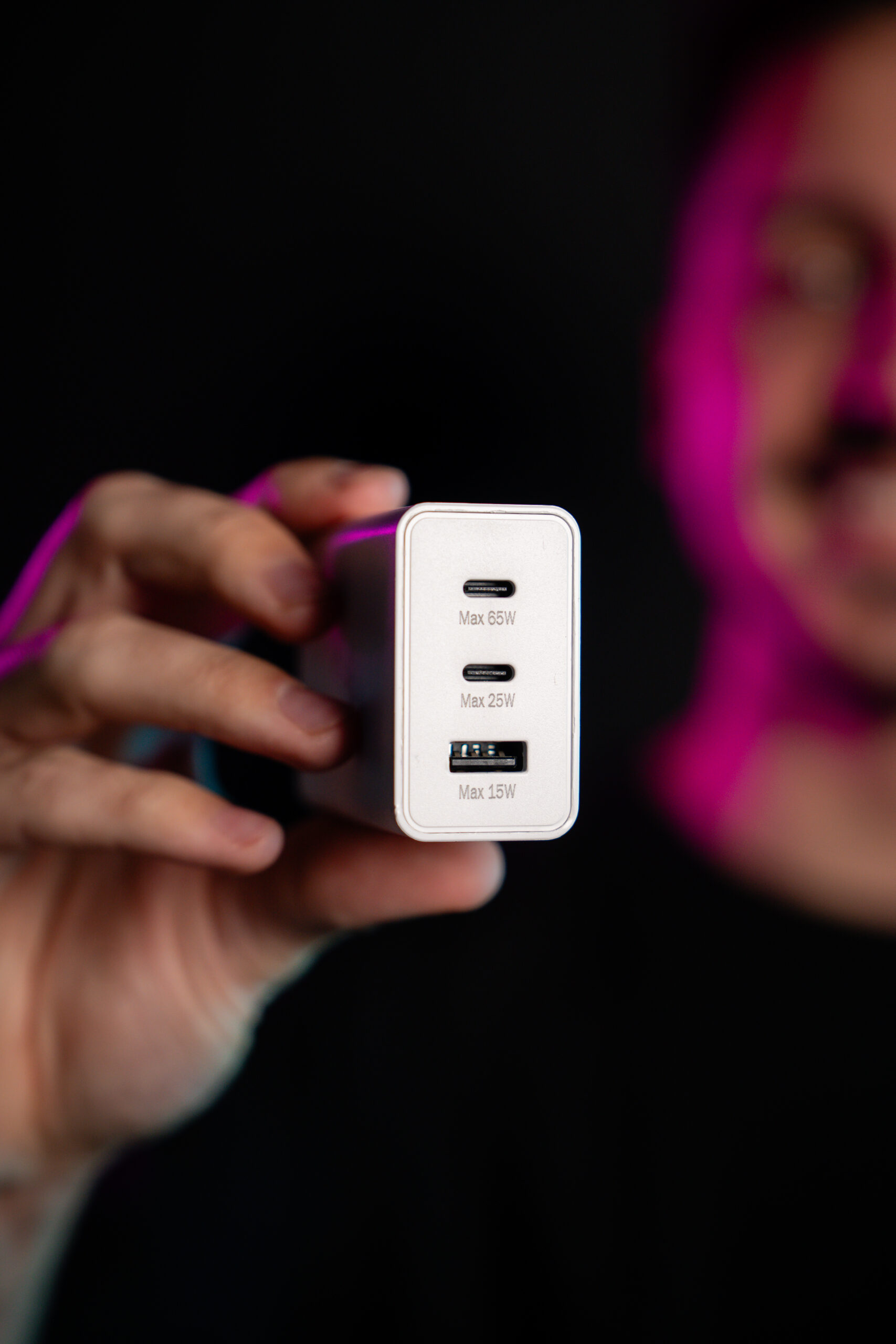 • Adaptor de priza cu 3 iesiri: 1x USB-C 65w, 1x USB-C 25w si 1x USB-A 15w